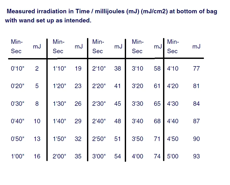 Measured irradiation for Time (minutes-Seconds) in Millijoules (mJ)/ Square Centimeters or (mJ/cm2) at bottom of case with wand set up as intended.